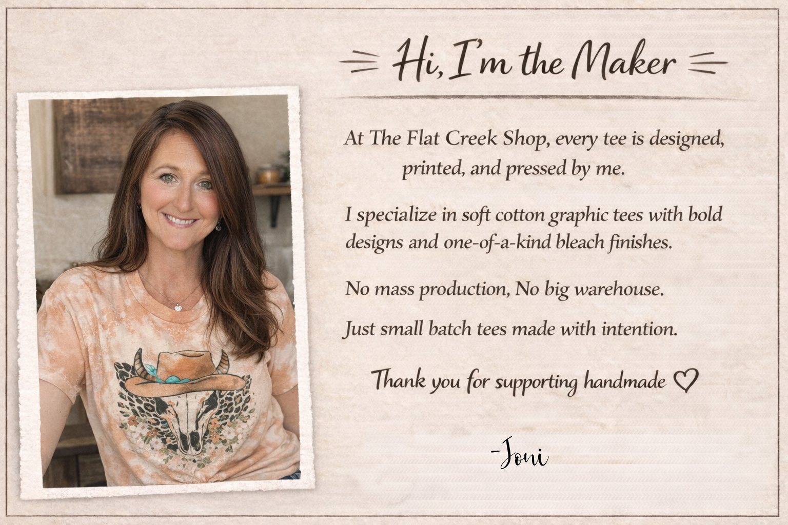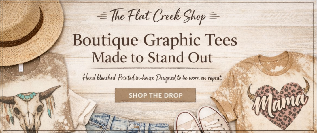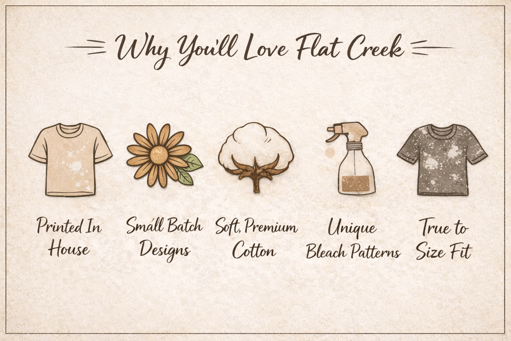 Flat Creek was created after we moved our family to the country in search of a simpler life and a dream of building something together. Weβre a small, family-owned shop creating unique bleached tees, apparel, digital designs, and gifts β all made with heart. From our little country home to yours, thank you for supporting our small business. π€