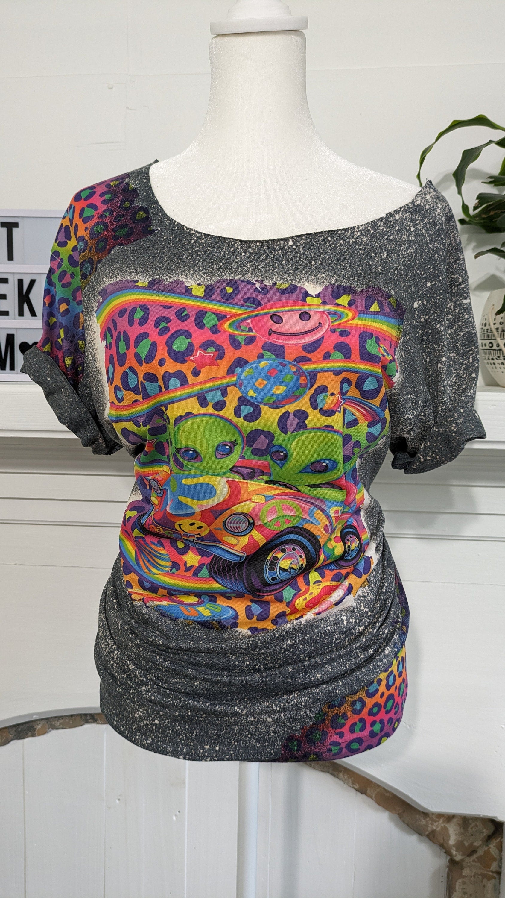 Bleached 90s Cartoon Tee | Neon Leopard Print Off-Shoulder Shirt